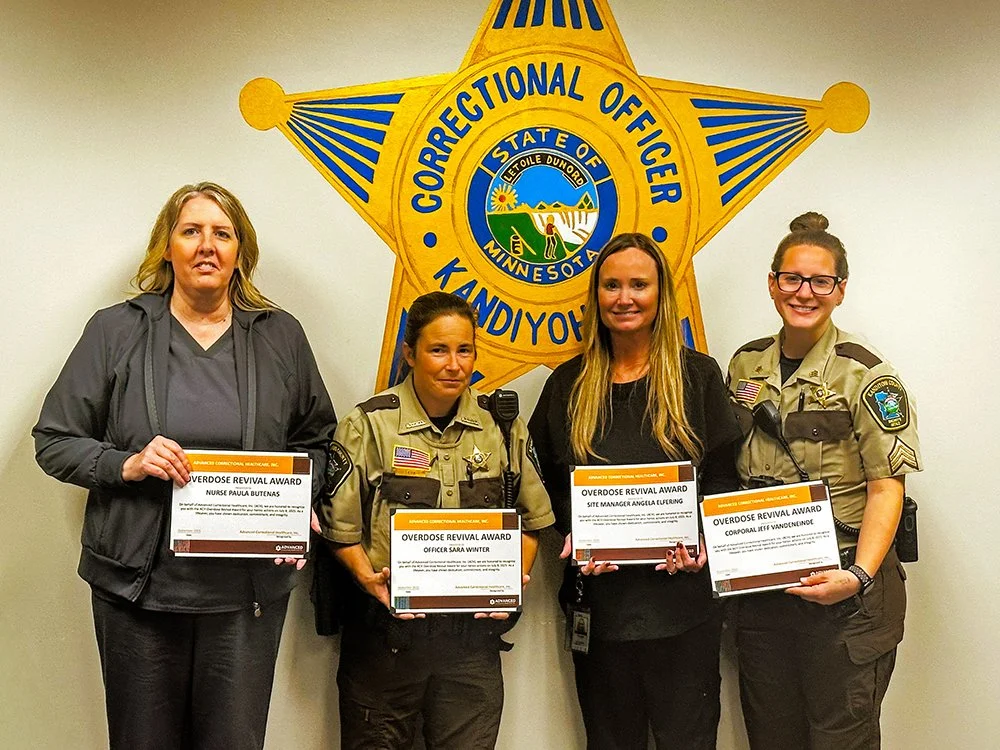 Saving a patient from overdosing is a team effort. To celebrate their actions and recognize all individuals involved, Advanced Correctional Healthcare, Inc. (ACH) presented the Overdose Revival Award, an award created to honor those who prevent a patient from overdosing, to Corporal VandenEinde, Officer Winter, Nurse Butenas, and Nurse Elfering.